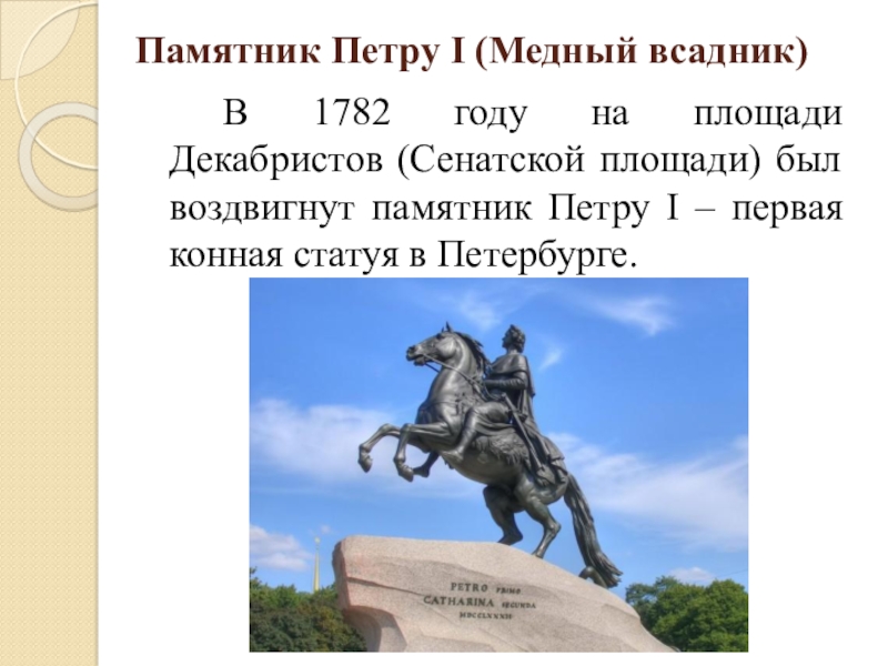 площади) был воздвигнут памятник Петру I – первая конная статуя в Петербурге.