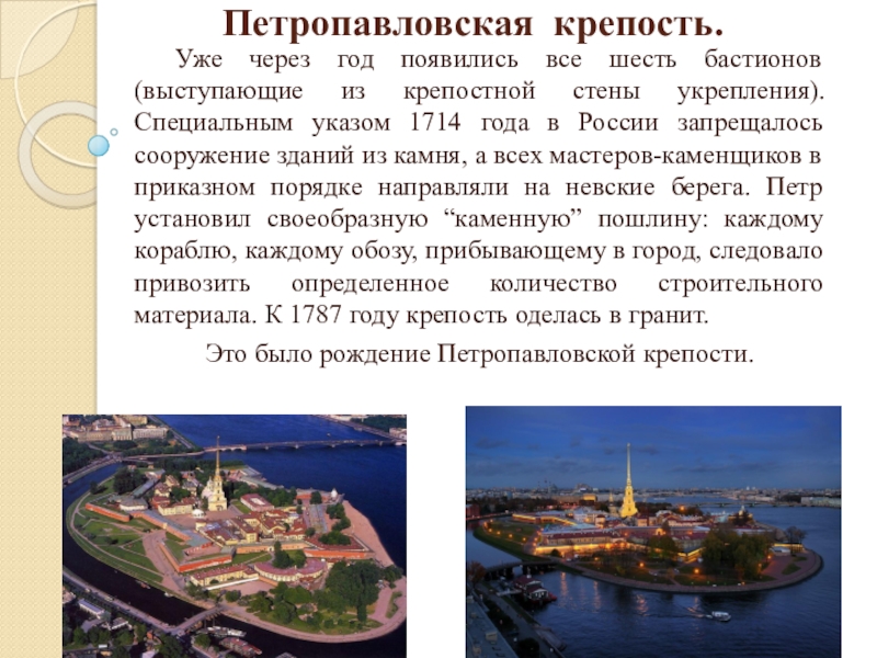 стены укрепления). Специальным указом 1714 года в России запрещалось сооружение зданий из камня, а всех мастеров-каменщиков в приказном порядке направляли на невские берега. Петр установил своеобразную “каменную” пошлину: каждому кораблю, каждому обозу, прибывающему в город, следовало привозить определенное количество строительного материала. К 1787 году крепость оделась в гранит.