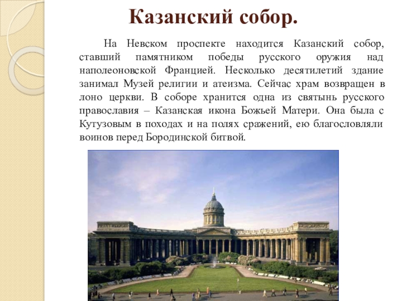 оружия над наполеоновской Францией. Несколько десятилетий здание занимал Музей религии и атеизма. Сейчас храм возвращен в лоно церкви. В соборе хранится одна из святынь русского православия – Казанская икона Божьей Матери. Она была с Кутузовым в походах и на полях сражений, ею благословляли воинов перед Бородинской битвой.