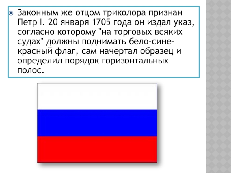 Слайд 5Законным же отцом триколора признан Петр I. 20 января 1705 года