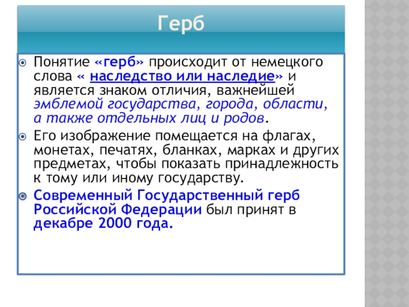 Понятие «герб» происходит от немецкого слова « наследство или наследие» и