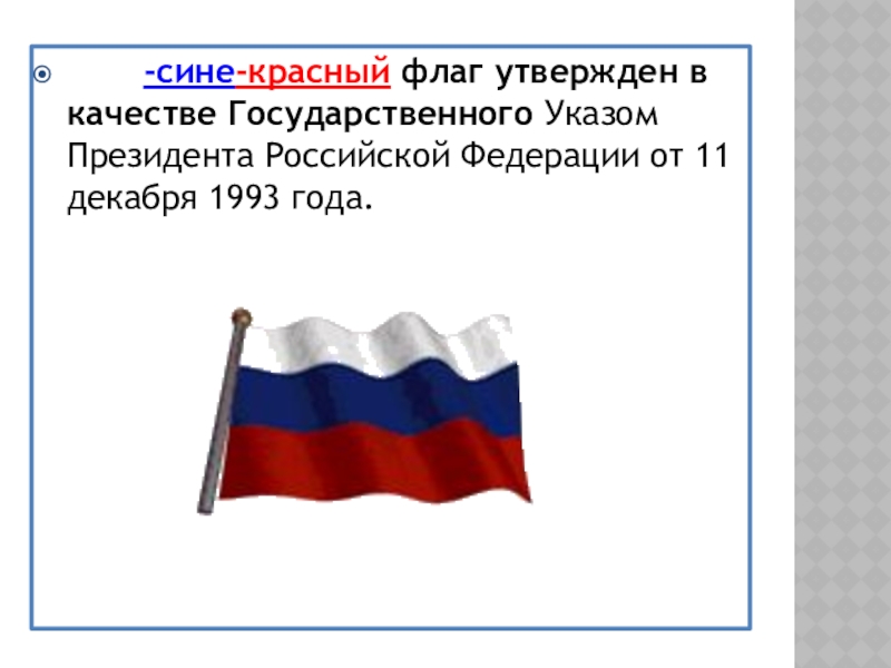 Слайд 16Бело-сине-красный флаг утвержден в качестве Государственного Указом Президента Российской Федерации от