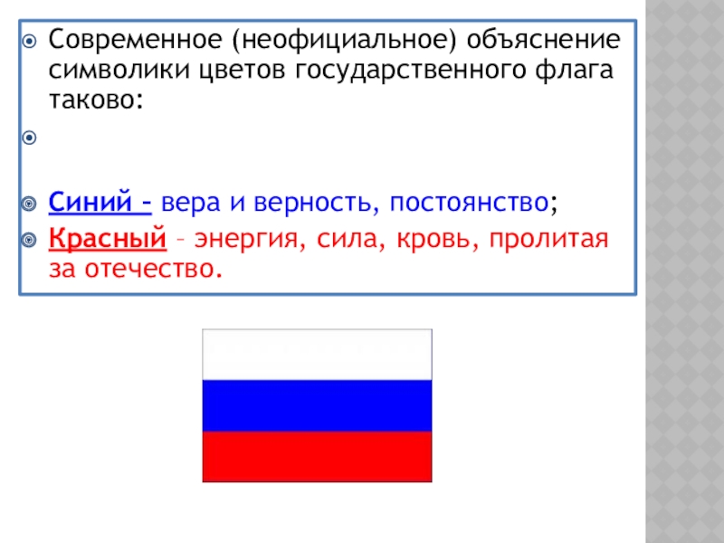 Слайд 17Современное (неофициальное) объяснение символики цветов государственного флага таково: