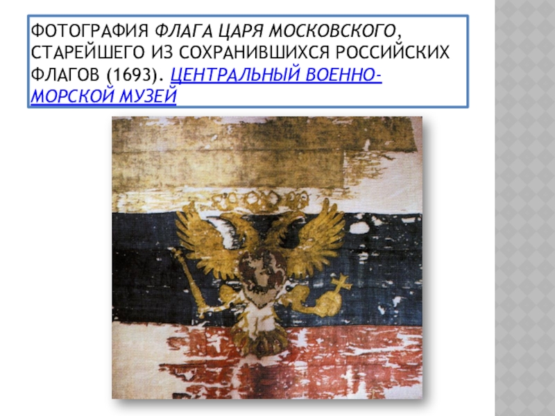 Слайд 8Фотография флага царя Московского, старейшего из сохранившихся российских флагов (1693). Центральный военно-морской музей