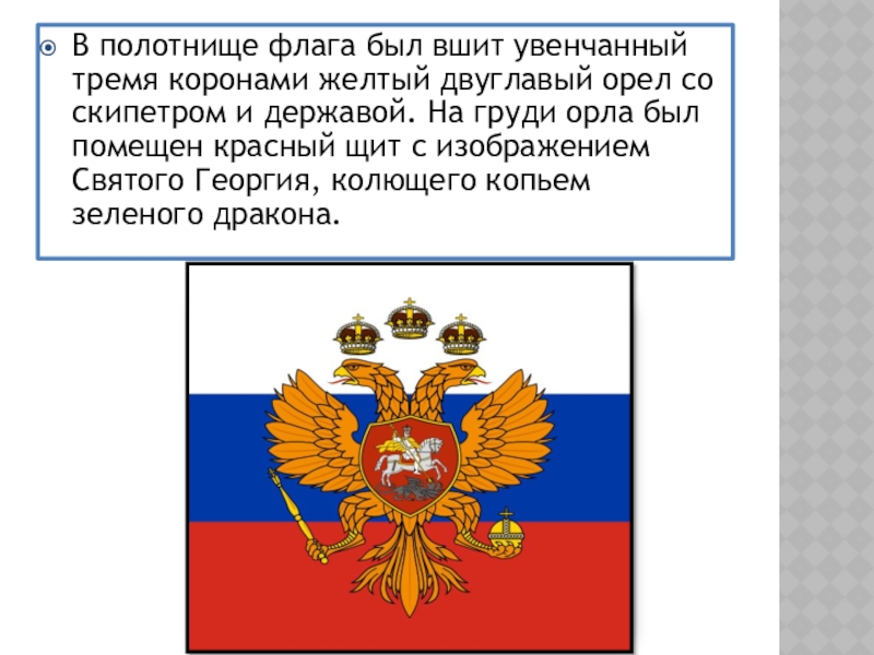 Слайд 7В полотнище флага был вшит увенчанный тремя коронами желтый двуглавый орел