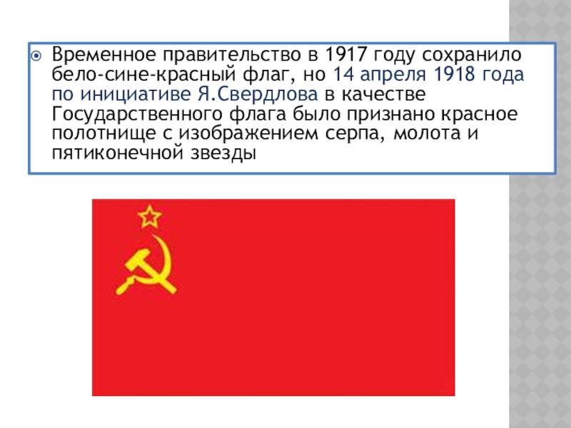 1918 года по инициативе Я.Свердлова в качестве Государственного флага было признано красное полотнище с изображением серпа, молота и пятиконечной звезды
