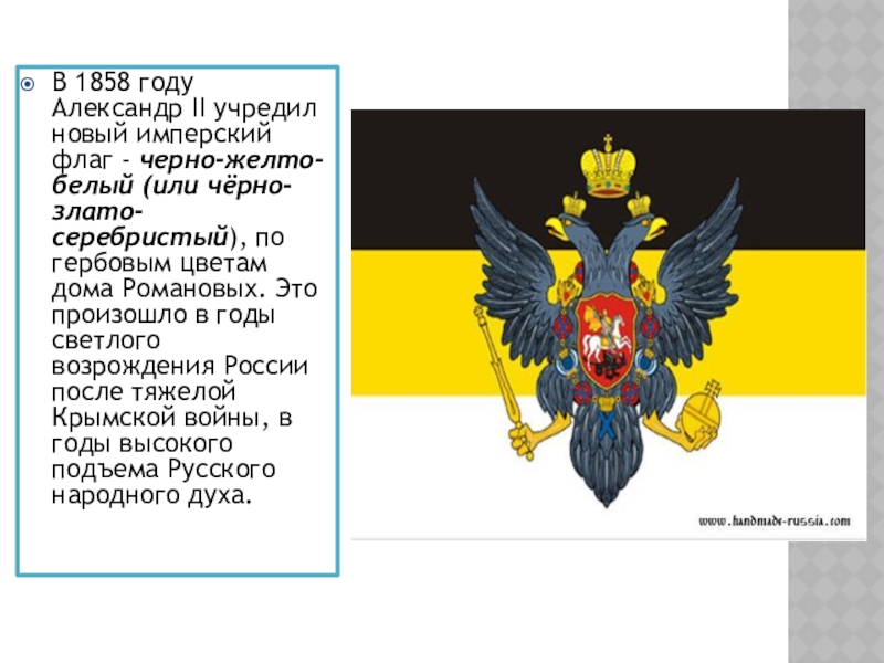 Слайд 10В 1858 году Александр II учредил новый имперский флаг - черно-желто-белый