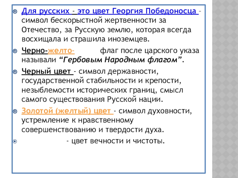 Слайд 12Для русских - это цвет Георгия Победоносца – символ бескорыстной жертвенности