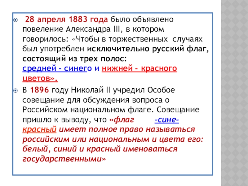 говорилось: «Чтобы в торжественных случаях был употреблен исключительно русский флаг, состоящий из трех полос: верхней - белого, средней - синего и нижней - красного цветов».
