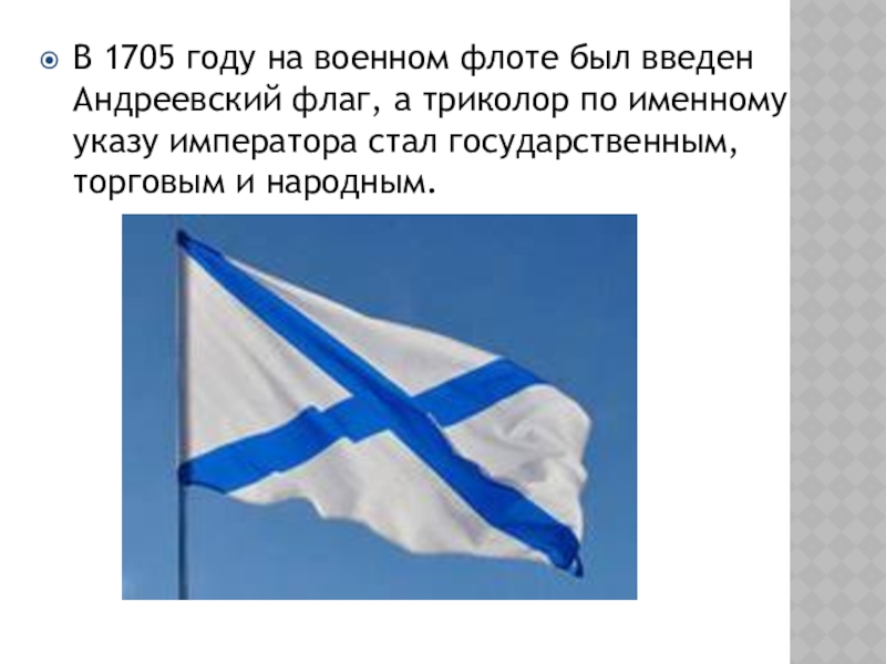 Слайд 9В 1705 году на военном флоте был введен Андреевский флаг, а