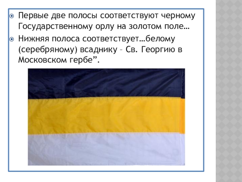 Слайд 11Первые две полосы соответствуют черному Государственному орлу на золотом поле…