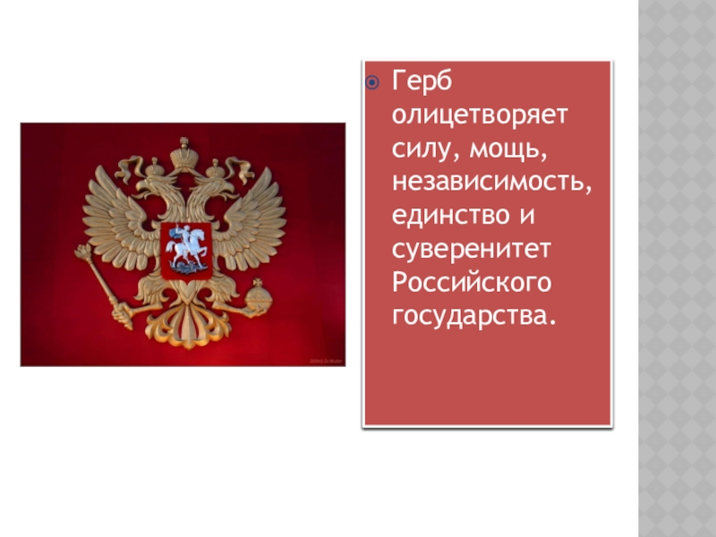 Слайд 21Герб олицетворяет силу, мощь, независимость, единство и суверенитет Российского государства.