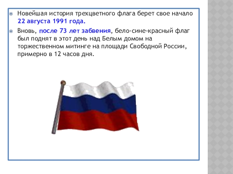 Слайд 15Новейшая история трехцветного флага берет свое начало 22 августа 1991 года.