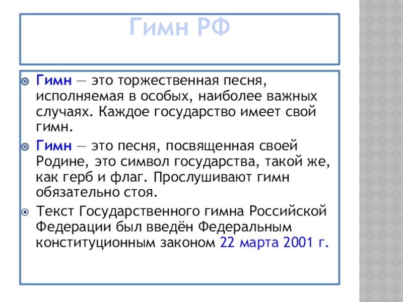 Гимн — это песня, посвященная своей Родине, это символ государства, такой же, как герб и флаг. Прослушивают гимн обязательно стоя.