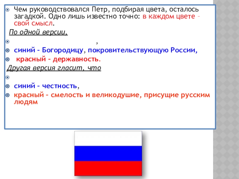 Слайд 6Чем руководствовался Петр, подбирая цвета, осталось загадкой. Одно лишь известно точно: