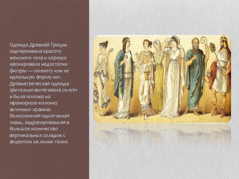 Слайд 10Одежда Древней Греции подчеркивала красоту женского тела и хорошо маскировала недостатки