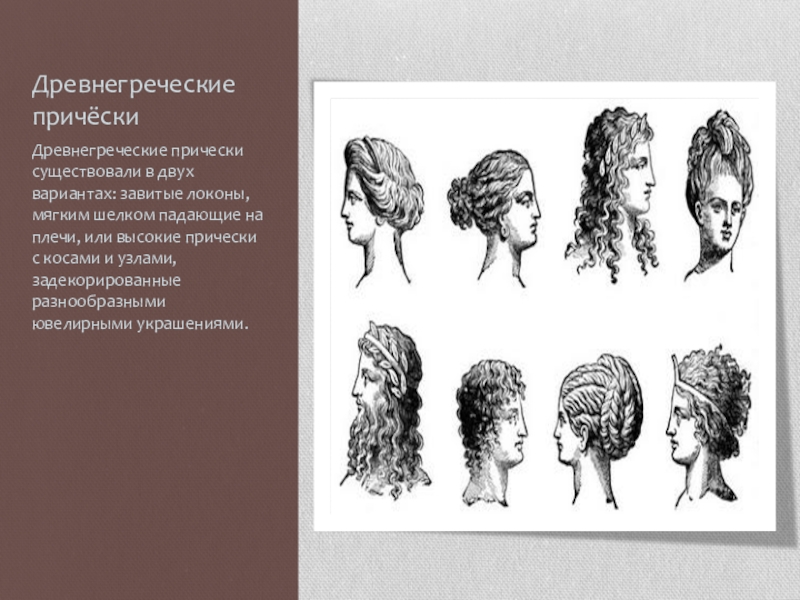 Древнегреческие причёскиДревнегреческие прически существовали в двух вариантах: завитые локоны, мягким шелком падающие на плечи, или высокие прически