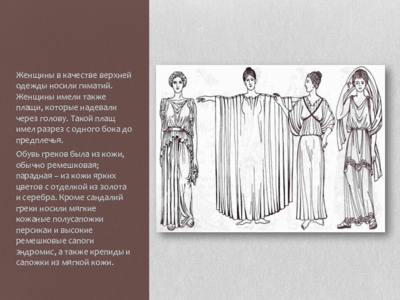 Слайд 4Женщины в качестве верхней одежды носили гиматий. Женщины имели также плащи,