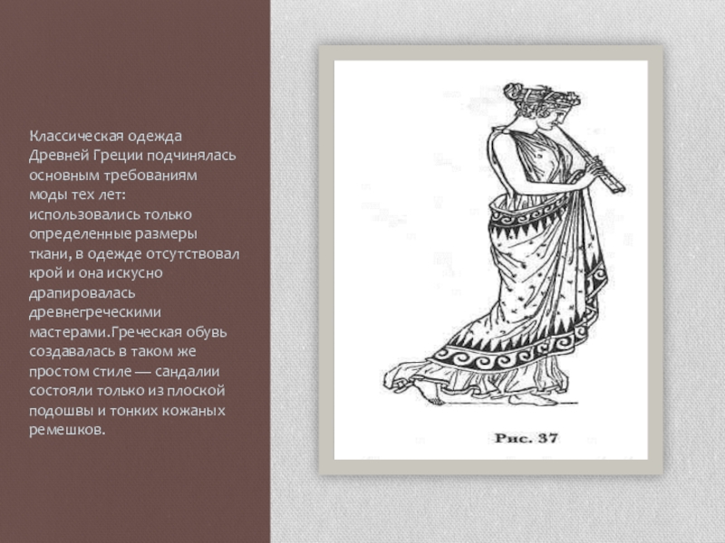 только определенные размеры ткани, в одежде отсутствовал крой и она искусно драпировалась древнегреческими мастерами.Греческая обувь создавалась в таком же простом стиле — сандалии состояли только из плоской подошвы и тонких кожаных ремешков.