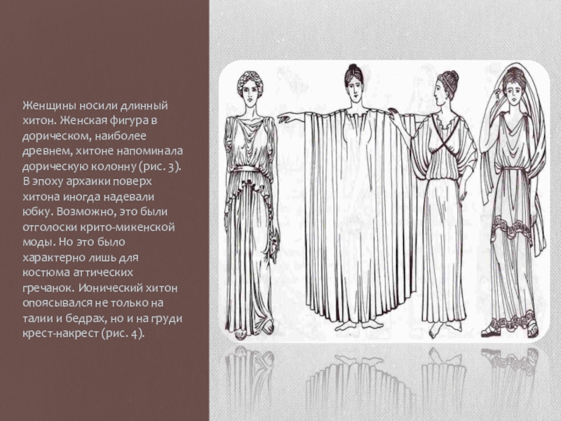 Женщины носили длинный хитон. Женская фигура в дорическом, наиболее древнем, хитоне напоминала дорическую колонну (рис. 3). В