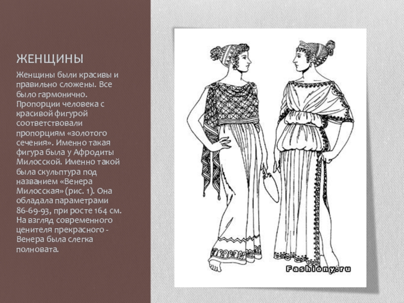 ЖЕНЩИНЫЖенщины были красивы и правильно сложены. Все было гармонично. Пропорции человека с красивой фигурой соответствовали пропорциям «золотого
