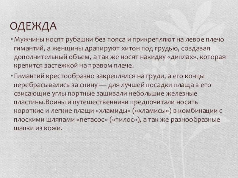 ОДЕЖДАМужчины носят рубашки без пояса и прикрепляют на левое плечо гимантий, а женщины драпируют хитон под грудью,