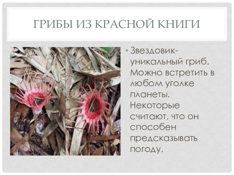 Грибы из Красной книгиЗвездовик-уникальный гриб. Можно встретить в любом уголке планеты. Некоторые считают, что он способен предсказывать