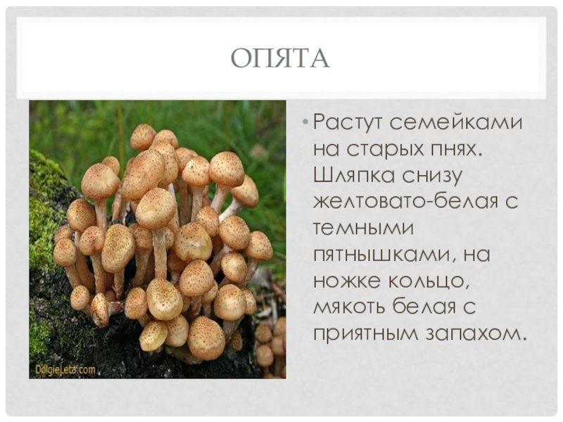 ОпятаРастут семейками на старых пнях. Шляпка снизу желтовато-белая с темными пятнышками, на ножке кольцо, мякоть белая с