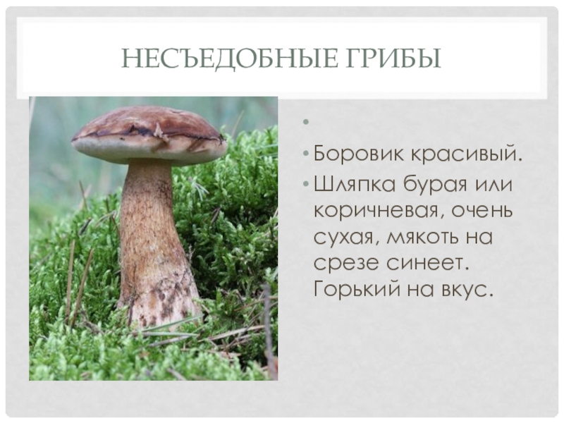 Несъедобные грибы Боровик красивый.Шляпка бурая или коричневая, очень сухая, мякоть на срезе синеет. Горький на вкус.
