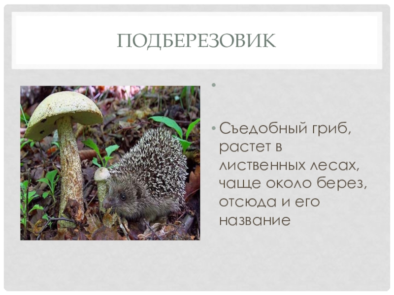 Подберезовик Съедобный гриб, растет в лиственных лесах, чаще около берез, отсюда и его название