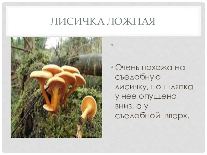 Лисичка ложная  Очень похожа на съедобную лисичку, но шляпка у нее опущена вниз, а у съедобной-