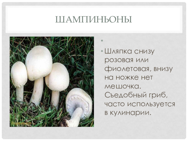 Шампиньоны  Шляпка снизу розовая или фиолетовая, внизу на ножке нет мешочка. Съедобный гриб, часто используется в