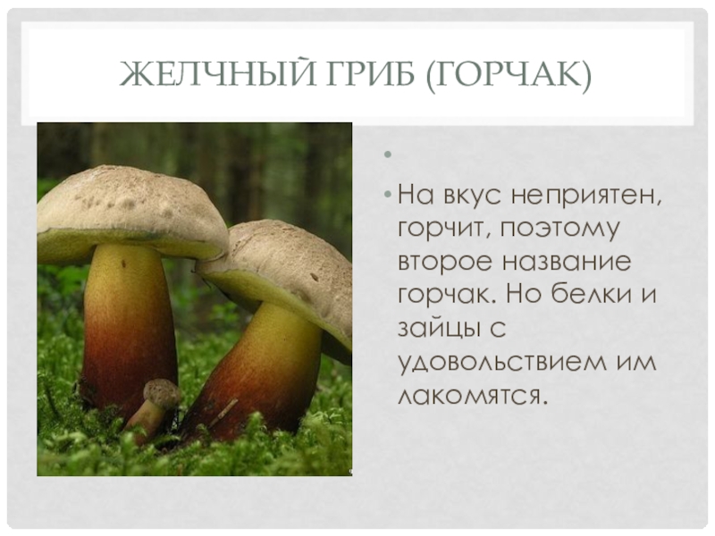 Желчный гриб (горчак) На вкус неприятен, горчит, поэтому второе название горчак. Но белки и зайцы с удовольствием