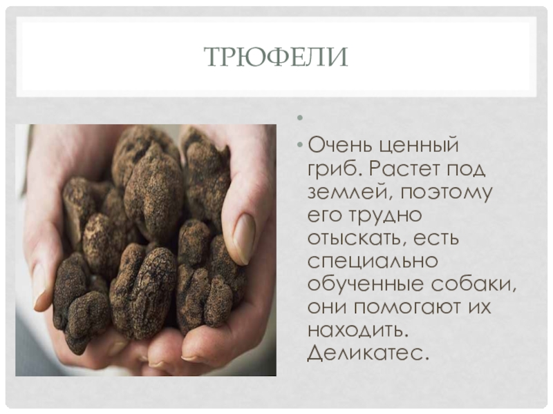 Трюфели  Очень ценный гриб. Растет под землей, поэтому его трудно отыскать, есть специально обученные собаки, они
