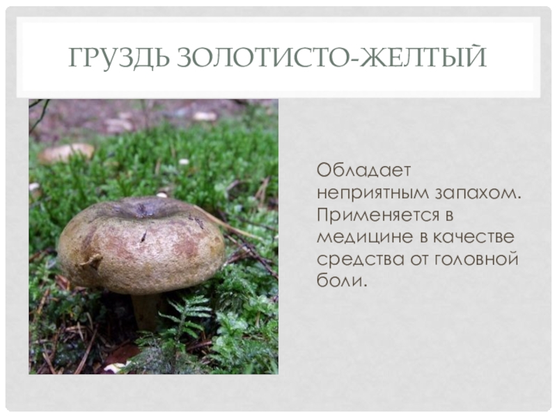 Груздь золотисто-желтый  Обладает неприятным запахом. Применяется в медицине в качестве средства от головной боли.