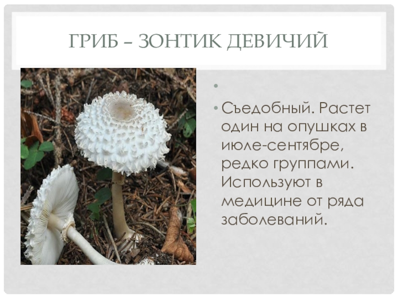 Гриб – зонтик девичий  Съедобный. Растет один на опушках в июле-сентябре, редко группами. Используют в медицине