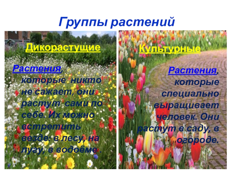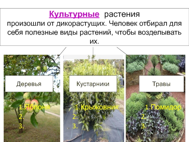 Растения, которые специально выращивает человек. Они растут в саду, в огороде.