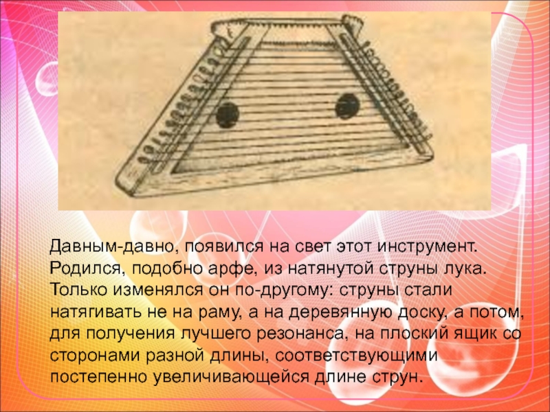Слайд 3 Давным-давно, появился на свет этот инструмент. Родился, подобно арфе,