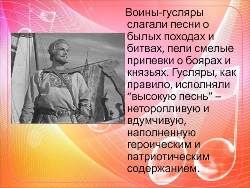 Воины-гусляры слагали песни о былых походах и битвах, пели смелые припевки о боярах и князьях.