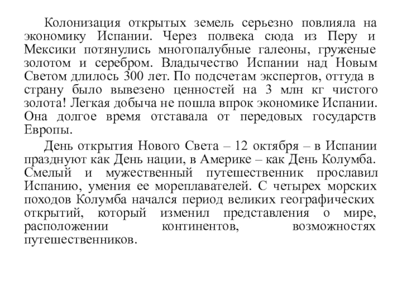 Слайд 7 Колонизация открытых земель серьезно повлияла на экономику Испании. Через полвека сюда