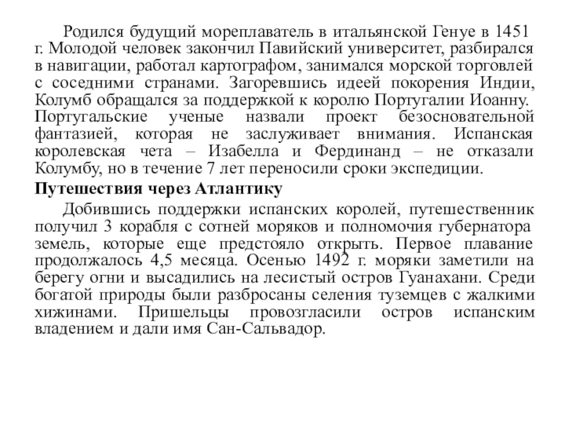 Христофор Колумб – великий мореплаватель, который первым из европейцев пересек в 1492 г. Атлантический океан и открыл