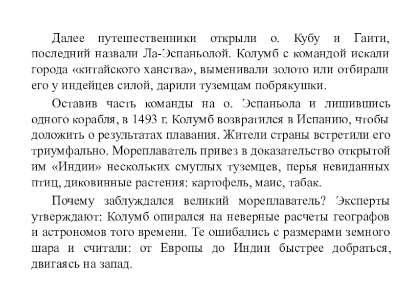 Далее путешественники открыли о. Кубу и Гаити, последний назвали Ла-Эспаньолой. Колумб с командой искали города «китайского ханства»,
