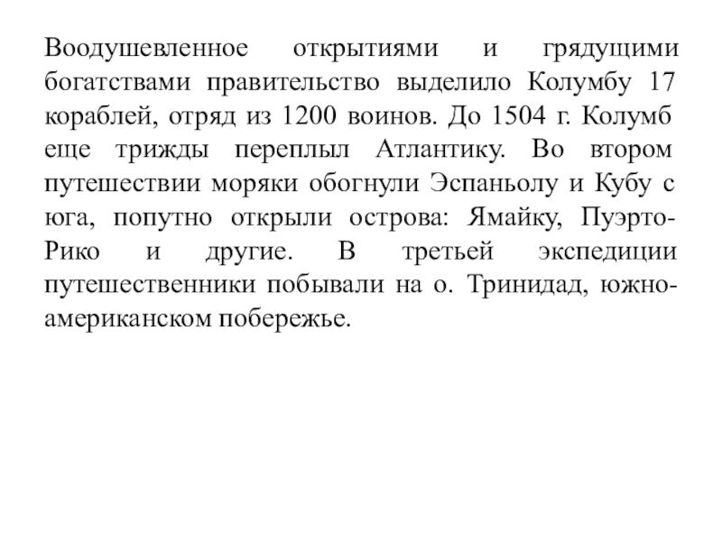 Воодушевленное открытиями и грядущими богатствами правительство выделило Колумбу 17 кораблей, отряд из 1200 воинов. До 1504 г.
