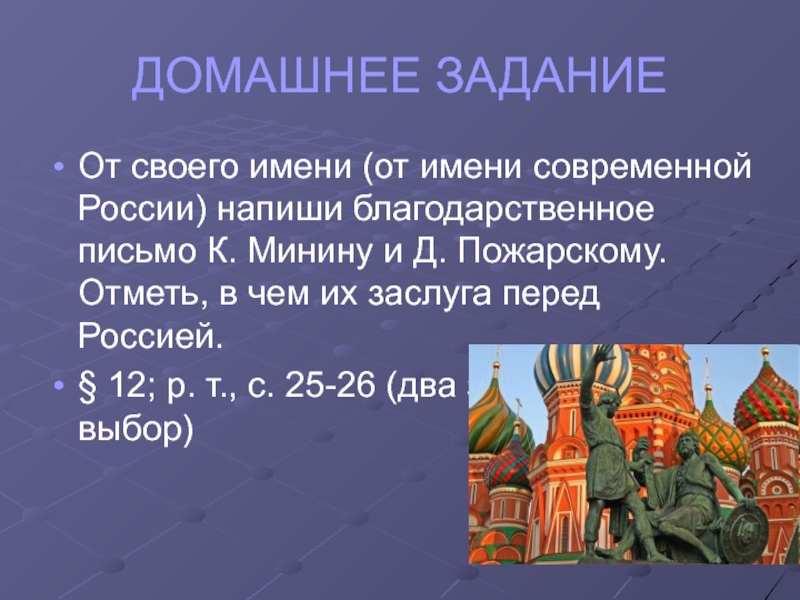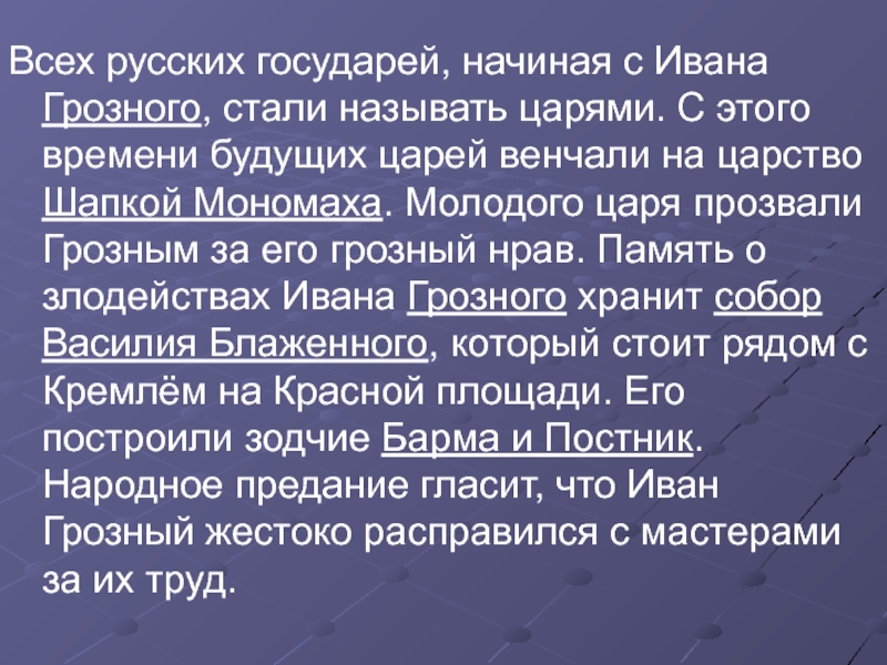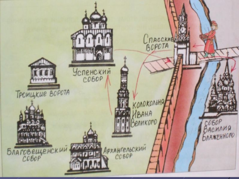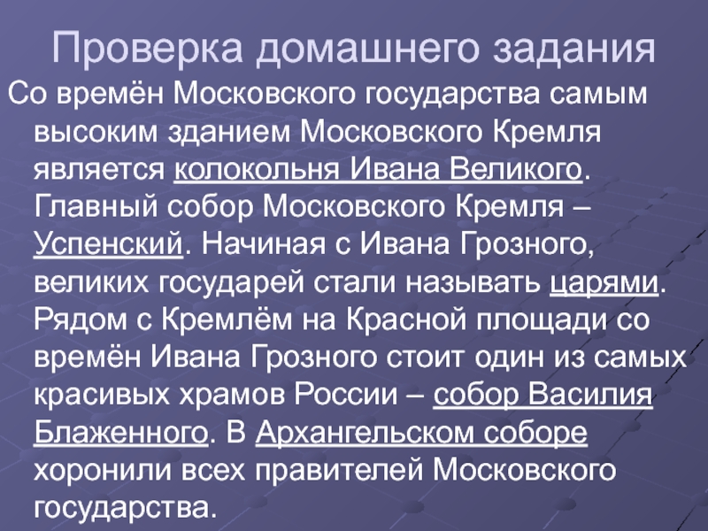 является колокольня Ивана Великого. Главный собор Московского Кремля – Успенский. Начиная с Ивана Грозного, великих государей стали называть царями. Рядом с Кремлём на Красной площади со времён Ивана Грозного стоит один из самых красивых храмов России – собор Василия Блаженного. В Архангельском соборе хоронили всех правителей Московского государства.