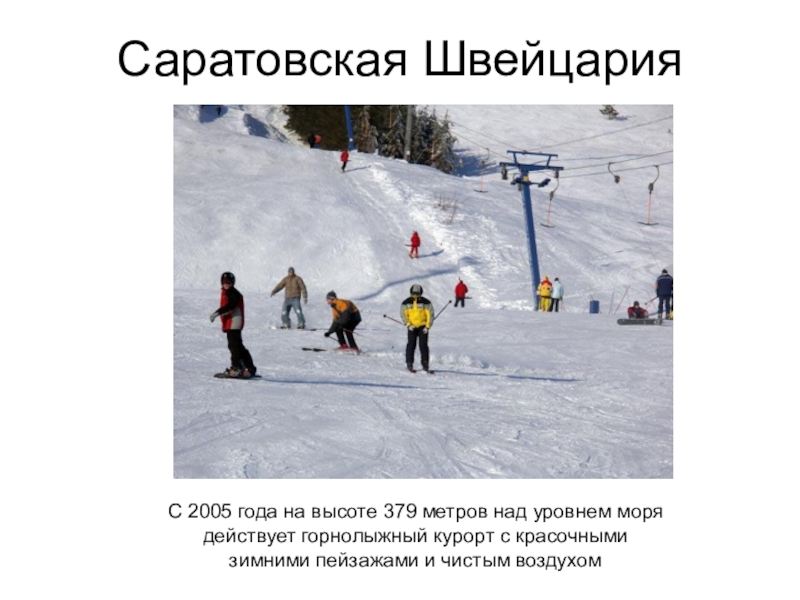 Саратовская ШвейцарияС 2005 года на высоте 379 метров над уровнем моря действует горнолыжный курорт с красочными зимними