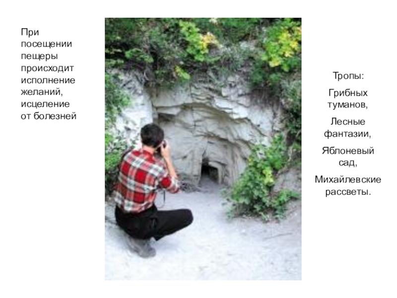 При посещении пещеры происходит исполнение желаний, исцеление от болезнейТропы:Грибных туманов, Лесные фантазии, Яблоневый сад, Михайлевские рассветы.
