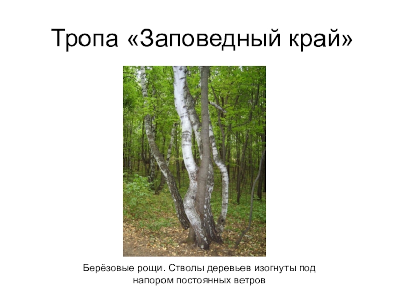 Тропа «Заповедный край»Берёзовые рощи. Стволы деревьев изогнуты под напором постоянных ветров