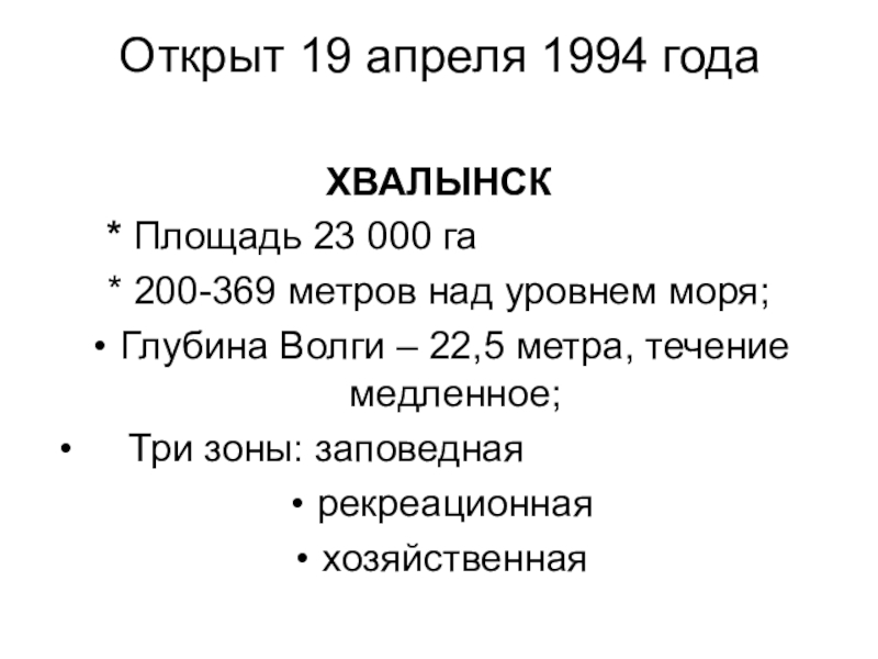Открыт 19 апреля 1994 года  ХВАЛЫНСК   * Площадь 23 000 га* 200-369 метров над