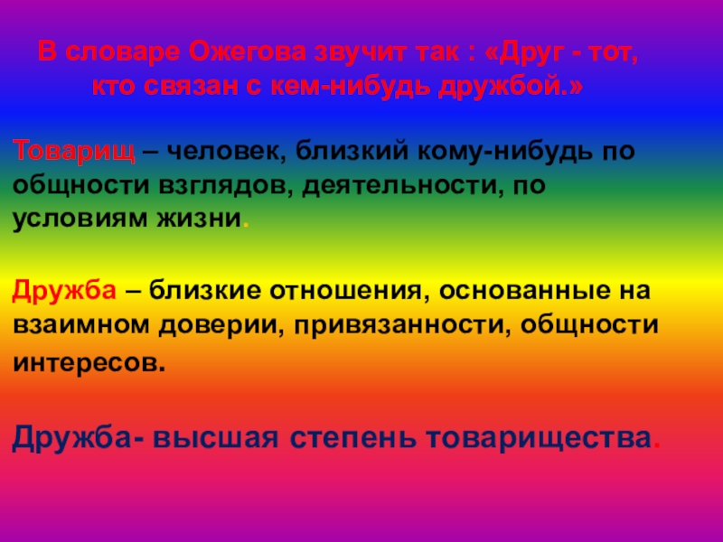 Товарищ – человек, близкий кому-нибудь по общности взглядов, деятельности, по условиям жизни.