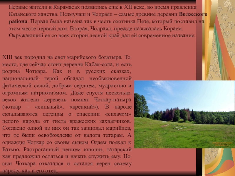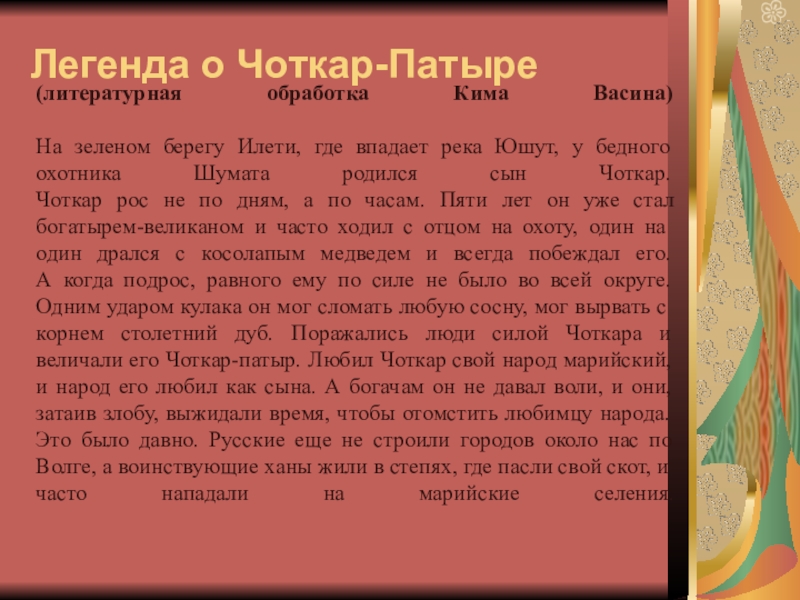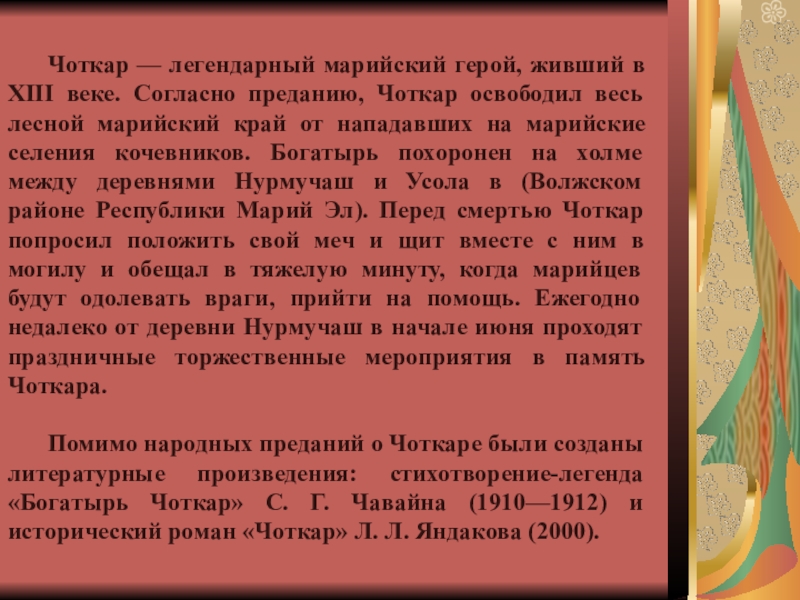 XIII век породил на свет марийского богатыря. То место, где сейчас стоит деревня Кабак-сола, и есть родина Чоткара. Как и в русских сказках, национальный герой обладал необыкновенной физической силой, добрым сердцем, мудростью и огромным патриотизмом. Даже спустя несколько веков жители деревень помнят Чоткар-патыра (чоткар – «сильный», «крепкий»). В народе складываются легенды о спасении «силачом» целого народа от гнета вражеских захватчиков. Согласно одной из них он так защищал марийцев, что те были освобождены от налога татарам. А однажды Чоткар со своим сыном Одаем поехал к Батыю. Растроганный пением юноши, татарский хан предложил остаться и начать служить ему. Но сын Чоткара отказался и остался верен своему народу, как и его отец.